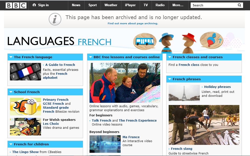 يحتوي موقع BBC Languages على العديد من دورات تعلم اللغة الفرنسية القائمة على الفيديوهات. وتتميز كل من هذه الدورات بوجود ألعاب وأوراق عمل قابلة للطباعة من أجل التطبيق على ما تعلمته. ويمكنك البدء من دورات المبتدئين وتتبعها حتى تصل إلى المستوى الذي تريده.