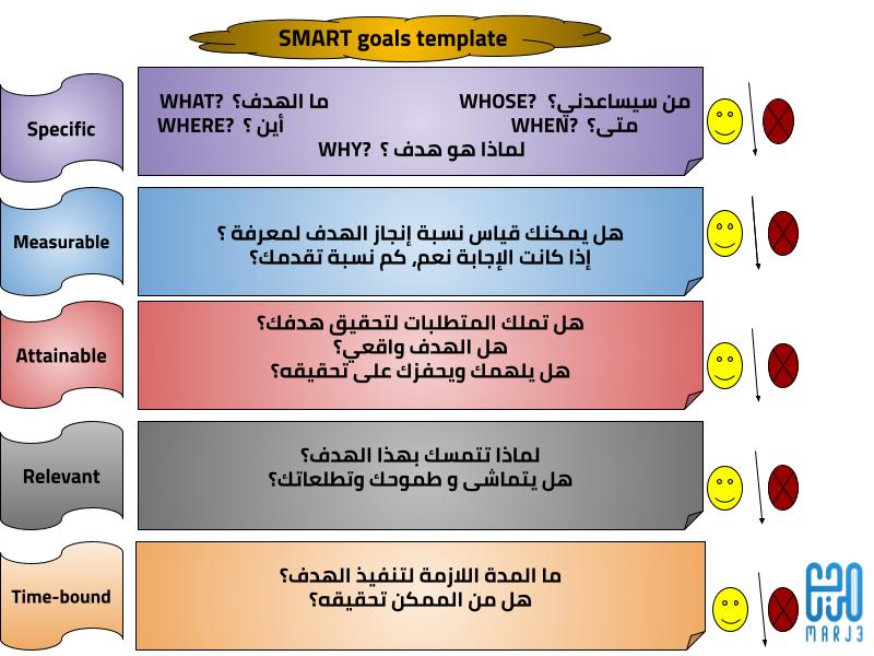 والآن إليك نموذج تطبيقي لهذه الأهداف الذكية يمكنك الاستعانة به لمعرفة أهدافك الذكية :