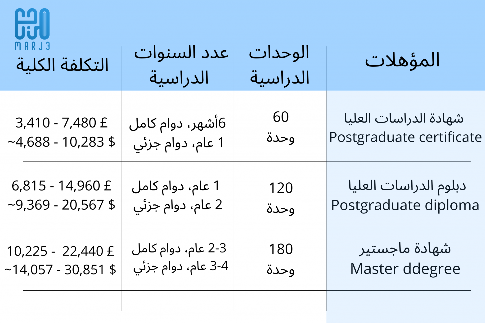 أما كطالب ماجستير تتراوح رسومك ما بين: