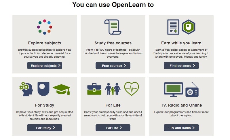 تتيح لك الجامعة الإطلاع على أكثر من 800 كورس متوفر بشكل مجاني عبر التعليم المفتوح (openlearn) من المستوى التمهيدي إلى الدراسات العليا. كما يعمل خبراء الجامعة المفتوحة أيضاً على دعم موقع futurelearn، أكبر مزود للدورات التدريبية المجانية للتعليم عن بعد عبر الإنترنت في المملكة المتحدة من هنا.
