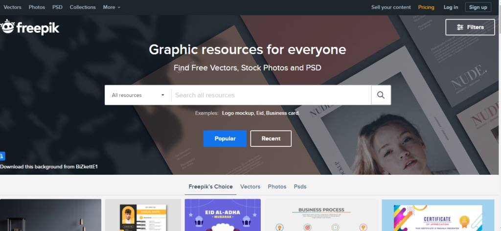 1- موقع فري بك (Freepik) يعتبر موقع freepik الأضخم والأشهر على الإطلاق في ما يُقدمه للمصممين، وذلك لاحتوائهِ على مكتبة متكاملة من القوالب التصميمة والرسومات و الأيقونات والصور بصيغ الاليستريتور (AI) و صيغ الفوتوشوب (PSD), وأيضا صيغ الصور (PNG) بجودة تصل إلى 8 بكسل. يمكنك استخدامه في أعمالك، أو التعديل على ملفاته أو الاستلهام من الأفكار التي يضمها.