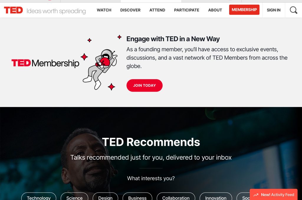 يغطي موقع (TED) موضوعات مختلفة لمجالات مثل التكنولوجيا والترفيه والتصميم والأعمال والقضايا العالمية التي بإمكانها تطوير لغتك عبر التمارين الصارمة التي يفرضها الموقع للمتعلمين .