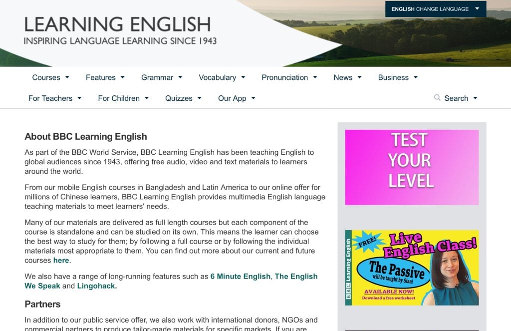 يحتوي موقع (BBC Learning English) على عدة أقسام مثل : قسم (Grammer)، قسم (Vocabulary)، قسم (listening) وأقسام أخرى للاختبارات. كما يمنحك الموقع كورسات متنوعة لتطوير اللغة الإنجليزية عن طريقه.